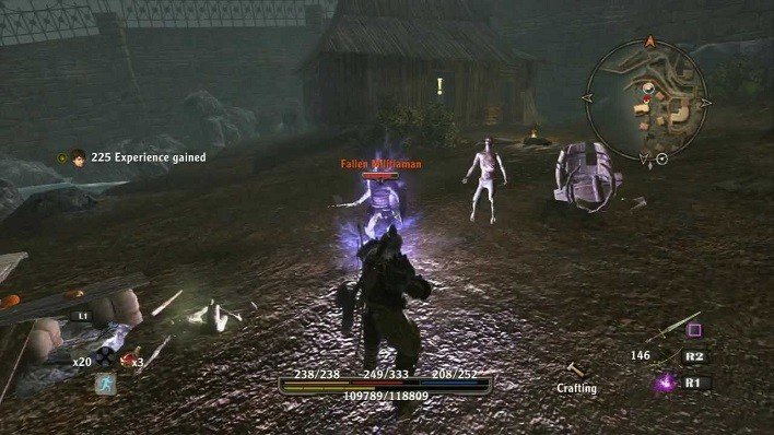 Nuestro protagonista puede equiparse todo tipo de armas y armadura sin penalización. Si exploramos lo suficiente podremos encontrar tres tipos de reliquias distintas que, quieras o no, apremian un poco este viaje tan agónico. Cada objeto, arma o consumible se podrá equipar asignándolo a uno de los botones del pad direccional. El resto de comandos es pegar saltos, rodar por el suelo o aporrear el botón de acción. También podemos pulsar los botones L y L2 para cambiar a estados de magia y arco y variar un poco en la forma que tenemos para aniquilar enemigos. No es que sea un mal combate, es simple, algo lento pero desde luego no es el peor de los elementos de Arcania: The Complete Tale.