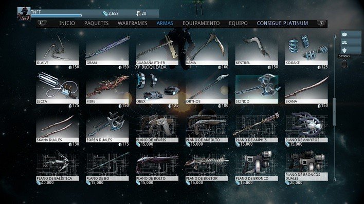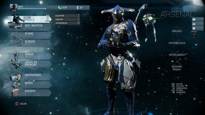 El traje de combate que lleva nuestro personaje se llama Warframe, mejorarlo y conocerlo es lo único que te permitirá completar con éxito las misiones a las que te vas a enfrentar. Al principio del juego nos tendremos que enfrentar a una decisión y es la elección del Warframe inicial. De izquierda a derecha tenemos a Excalibur, un warframe muy equilibrado en combate para novatos; Mag es un Warframe orientado a eliminar a nuestros enemigos usando poderes, mejor para jugadores intermedios; y finalmente tenemos a Loki, un Warframe diseñado para cambiar el transcurso del combate, ideal para jugadores creativos o muy avanzados.