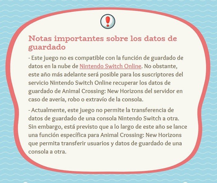 Partida insalvable: Animal Crossing: New Horizons no es compatible con el guardado en la nube de Nintendo Switch Online. Si por algún motivo se corrompe el archivo de juego, se avería la consola o se daña, adiós a la partida de absolutamente todos los que jugaban a New Horizons. (Por cierto, borre mi propia partida para enseñaros el comienzo del juego, eso es irrecuperable ya).