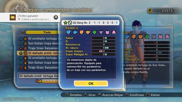 Para vestir a nuestro personaje tenemos una curiosa y bastante escasa selección de ropa que, depende lo que nos pongamos mejorará nuestras características. Si eres namekiano, Monstruo o Freezer tus opciones de ropa van a ser muy limitadas…