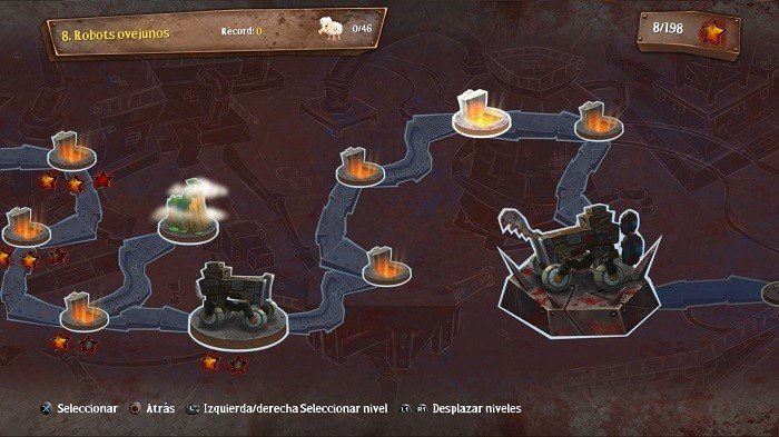 Los primeros niveles son literalmente tutoriales para que entendamos como se usan todas las herramientas y una vez le hayamos pillado el truco nos soltarán en ese mundo tan salvaje que es el sistema de almacenamiento de ovejas de los Worms. Pinchos, sierras, guadañas, explosiones, caidas mortales, obstáculos gigantes, saltos imposibles, pulsadores bomba, sensores de proximidad y un sin fín de objetos más nos complicarán nuestra aventura hasta la meta y con la dificultad creciente cada vez vamos a teñir más de rojo a nuestras ovejas… si es que os queda alguna.