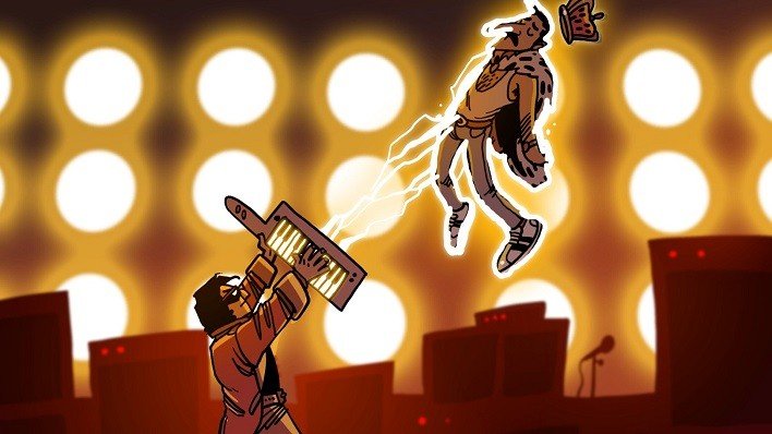 Una de las características de esta saga es que hay una historia en plan cómic, que nos explica cómo vamos de un rival a otro para salvar el mundo de la música. La premisa es muy absurda, ya que tras derrotar a los malos de la primera parte, un nuevo villano aparece y le quita el corazón a Frederic, por lo que tiene que iniciar un viaje por todo el mundo para descubrir cómo recuperarlo. Esto le llevará a enfrentarse a todo tipo de «músicos» que sirven de parodia para figuras famosas como Michael Jackson o Gengis Khan, a sencillos clichés para representar el estilo musical del que formará parte el siguiente tema. No es que sea un argumento brillante, pero es graciosillo, con varias bromas bien llevadas a cabo, y multitud de referencias a otros juegos y sagas famosas. Incluso el coche de Frederic es un DeLorean, para que os hagáis una idea. Eso sí, poned en opciones el idioma en español, ya que varias de las bromas están muy bien traducidas.