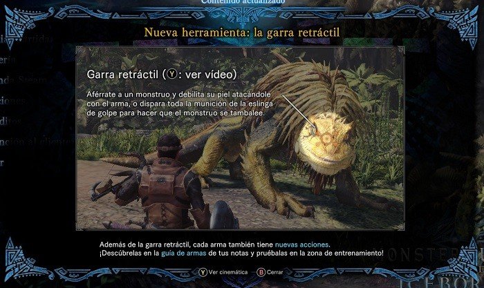 - Nueva herramienta: garra retráctil, una garra que nos permite subirnos a los monstruos, debilitar partes concretas e incluso lanzarlos contra el entorno.