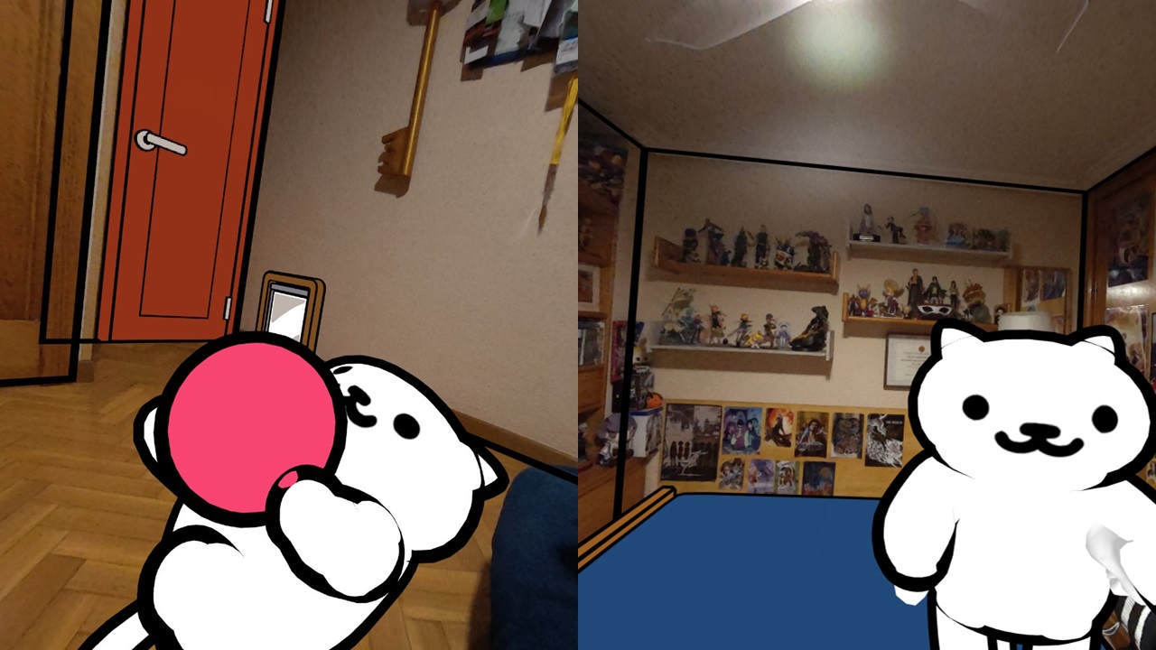 Al menos, si tenemos Quest 3 tenemos una novedad realmente buena: Neko Atsume Purrfect hace uso de la tecnología Mixed Reality para traer a nuestro gatete favorito a nuestra casa real. Lo que hayamos marcado como cama, mesa o puerta aparecerá representado con el estilo del juego. Luego nosotros ponemos un juguete y una puerta para gatos en una pared, ¡y listo!