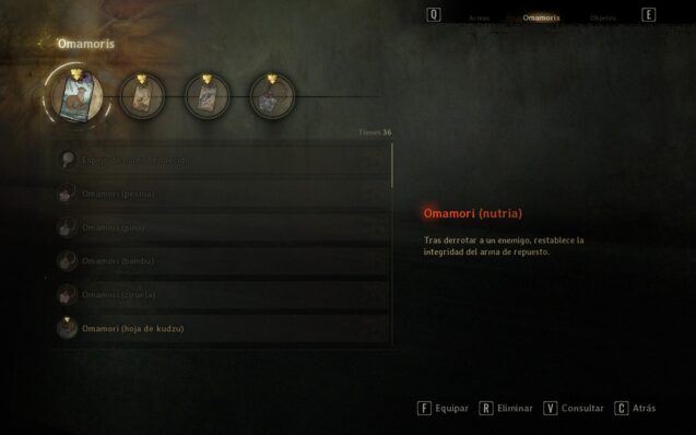 Los omamoris son unos amuletos que puedes conseguir y que tienen ventajas pasivas como aumentar tu vida, resistencia… anular el deterioro de las armas con ataques especiales, reparar armas guardadas, recuperar vida al recoger objetos o hacer contrataques… etc.