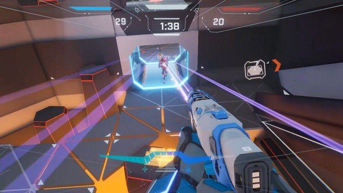 A cambio, es cierto que hace todo mucho más accesible, además de asegurarse compatibilidad total con la futura versión de PSVR, ya que todo funciona como si tuviéramos un Aim Controller en la mano. Si esto supone tener cross-play con dicha versión en el futuro, aumentando así la comunidad de usuarios, lo acepto, pese a que sea muy extraño tanto en PC como en Oculus Quest. Este arma será siempre el mismo para todos, ya que como en los arena shooter clásicos, no hay un equipamiento a elegir en Solaris: Offworld Combat ni nada por el estilo. Todos empezamos con el mismo equipo, cogiendo las demás armas y objetos por el escenario al pasar por diferentes plataformas.