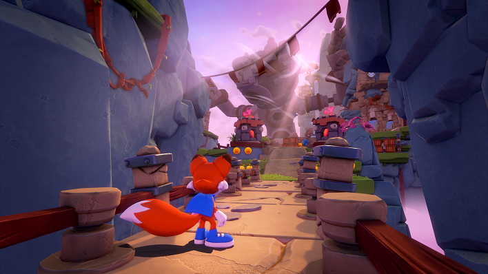 Básicamente, Super Lucky’s Tale es un plataformas 3D con una cámara pseudo-fija que recuerda a la vista en Super Mario 3D World. El único control que tenemos es para girar algo el ángulo de la cámara, aunque no siempre tendremos esta opción, así que casi como si nos olvidamos del stick derecho.