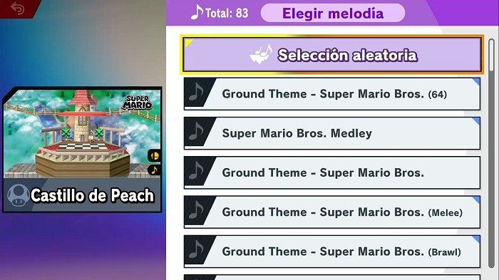 También tenemos la opción de elegir al azar o elegir la canción que queremos que suene en el escenario de las que tenemos desbloqueadas de la franquicia de ese escenario.