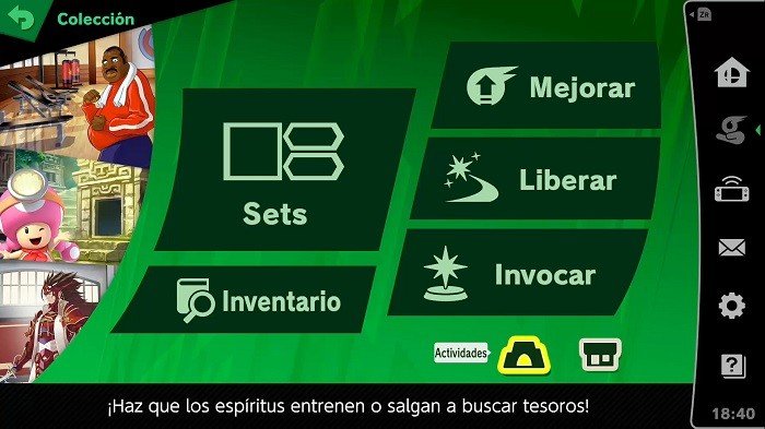 En la nueva pantalla podremos darles de comer a los amiibos para que suban rápido de nivel, darles espíritus principales para mejorar sus estadísticas, darles espíritus de apoyo para que consigan habilidades extra y cambiar el patrón de colores. Recordad que no se pueden personalizar los ataques por lo que no perdáis tiempo buscando la opción.