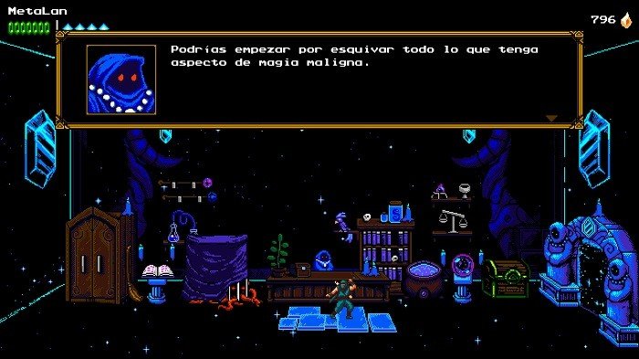 Guapifeo, por si alguien se lo pregunta y espero que así sea, es quien va a salvarnos de morir todas las veces. En The Messenger no hay un sistema de vida y continuaciones, sino que cada vez que morimos aparecerá Guapifeo para salvarnos y dar marcha atrás en el tiempo hasta el anterior punto de control.